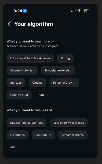 Instagram just announced they're testing a "Your Algorithm" feature where you can manually toggle topics in your Reels feed. You'll be able to go into settings and tell the app "show me more film photography" or "never show me college football again" with actual permanent controls that go beyond the basic "Not Interested" button.
